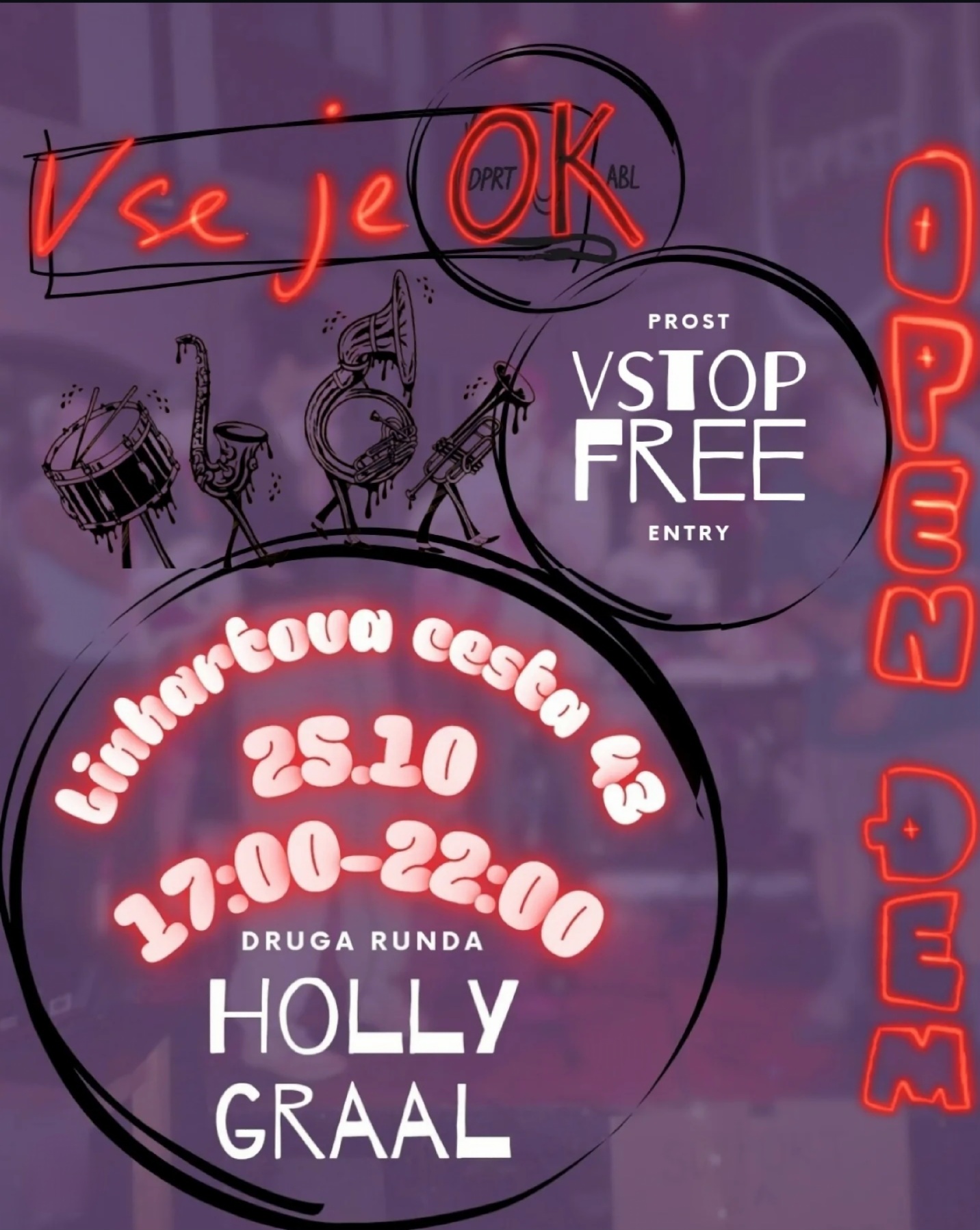 Drugi dogodek imenovan “Holly Graal” je poleg 2x večjega obiska, zabeležil tudi prvo menjavo lokacije. EN teden pred dogodkom smo izvedeli, da na prvotni lokaciji izvedba ne bo mogoča, zato se je iskala zamenjava. Nasproti so nam prišli iz Avtonomne cone PLAC. Na začetku izpad elektrike – ja, tako hudi đemerji se udeležujejo našega dogodka, a smo to hitro rešili. Večji in zaprt prostor nam je omogočil svobodno gibanje kljub zimi, ogromno novih glasbenikov in poslušalcev se je udeležilo dogodka, zaradi katerih smo šteli obisk približno 90 ljudi. Vse je zopet “potonal” Studio UHO. Sponzorski izdelki so bili namenjeni prostovoljnim prispevkom, vsak si je lahko v zameno za podporo Odprtega Kabla vzel karkoli. Zopet se je pelo in igralo 5 ur, na koncu pa smo že tradicionalno zaključili večer z odštevanjem do 22.00 ure.